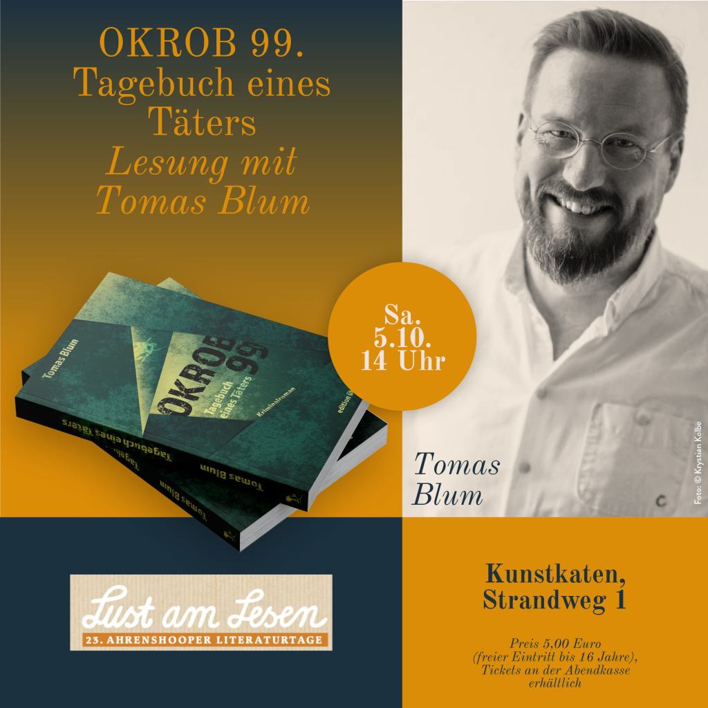 Der neue Kriminalroman ist Tomas Blums zweiter Roman. „Okrob 99 – Tagebuch eines Täters“ nutzt die Pflege als Sinnbild für den Umgang der Menschheit mit sich selbst und mit der aktuellen Demokratiekrise. Der Protagonist, Matthis Andres, ist ein Pfleger, der glaubt, dass er stets das Beste für die Menschen tut, die er betreut. Dabei überschreitet er die Grenze zwischen Hilfe und Zerstörung. Tomas Blum selbst hat während seines Studiums vier Jahre lang in der Pflege gearbeitet und diese Erfahrungen tief in die Erzählung integriert.